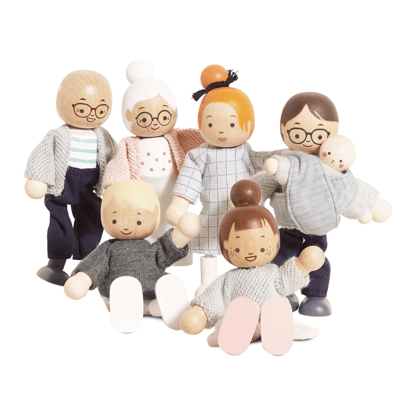 Welcome the sweetest little doll family to their new home — featuring parents, grandparents, children, and a tiny baby with carrier. Each figure is hand-finished, posable, and crafted from FSC®-certified wood, dressed in beautifully made miniature outfits. Ready to move in and fill your dolls’ house with love and laughter.